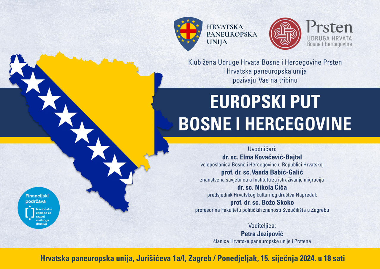 Klub žena Udruge Hrvata Bosne i Hercegovine Prsten i Hrvatska paneuropska unija pozivaju Vas na tribinu „Europski put Bosne i Hercegovine”.