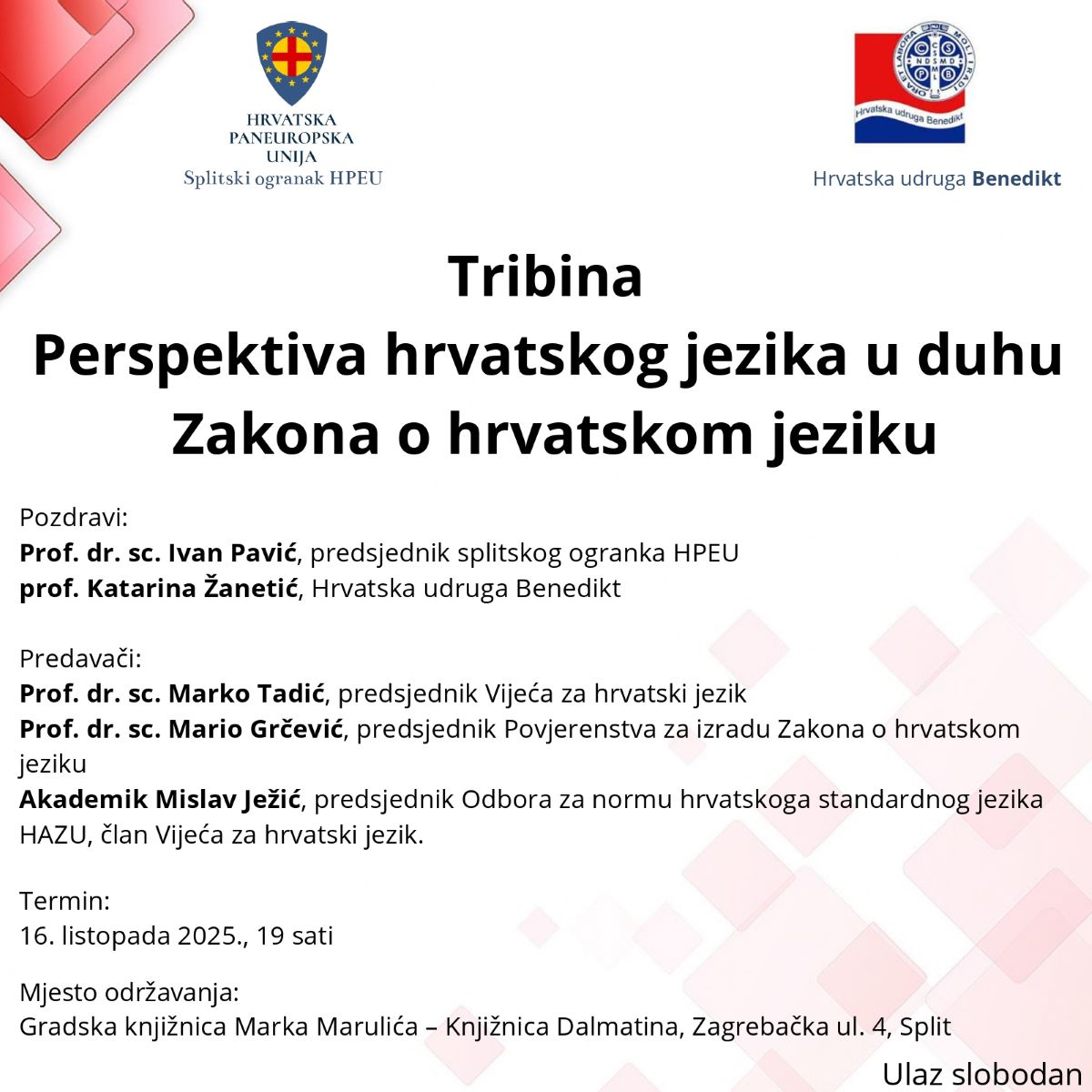 Splitski ogranak Hrvatske paneuropske unije u suradnji s Hrvatskom udrugom Benedikt, organizira tribinu pod naslovom „Perspektiva hrvatskoga jezika u duhu Zakona o hrvatskom jeziku“.