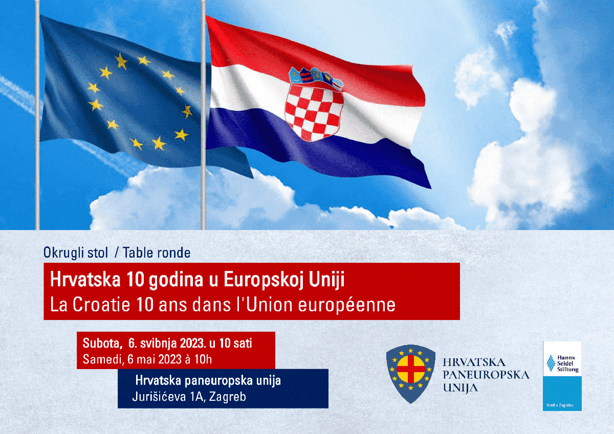 Hrvatska paneuropska unija i Zaklada Hanns Seidel – Ured u Zagrebu organiziraju u subotu, 6. svibnja 2023. s početkom u 10 sati okrugli stol „Hrvatska 10 godina u Europskoj uniji“ u Hrvatskoj paneuropskoj uniji.