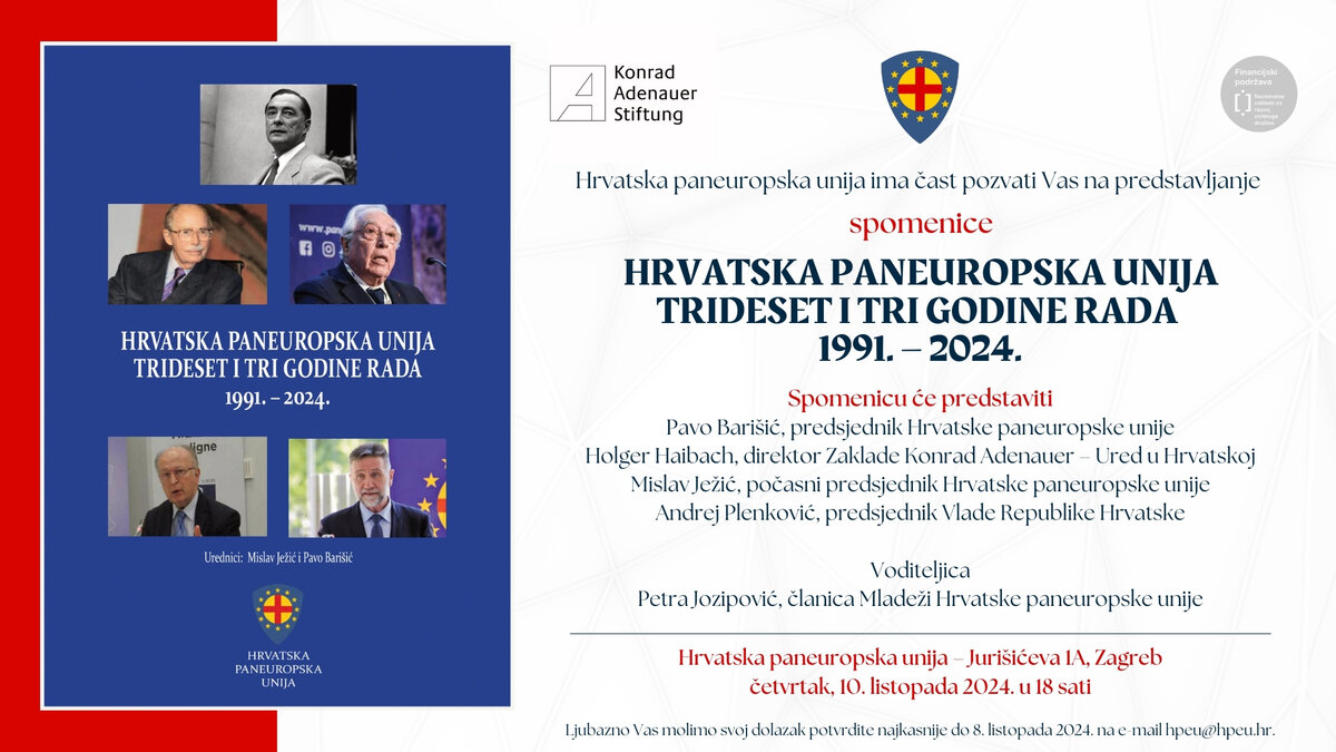 Sa zadovoljstvom Vas pozivamo na predstavljanje Spomenice Hrvatske paneuropske unije, koja je izašla povodom trideset i triju godina njezina rada (1991. – 2024.).