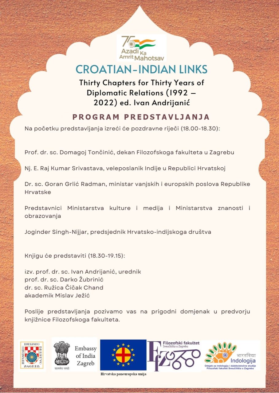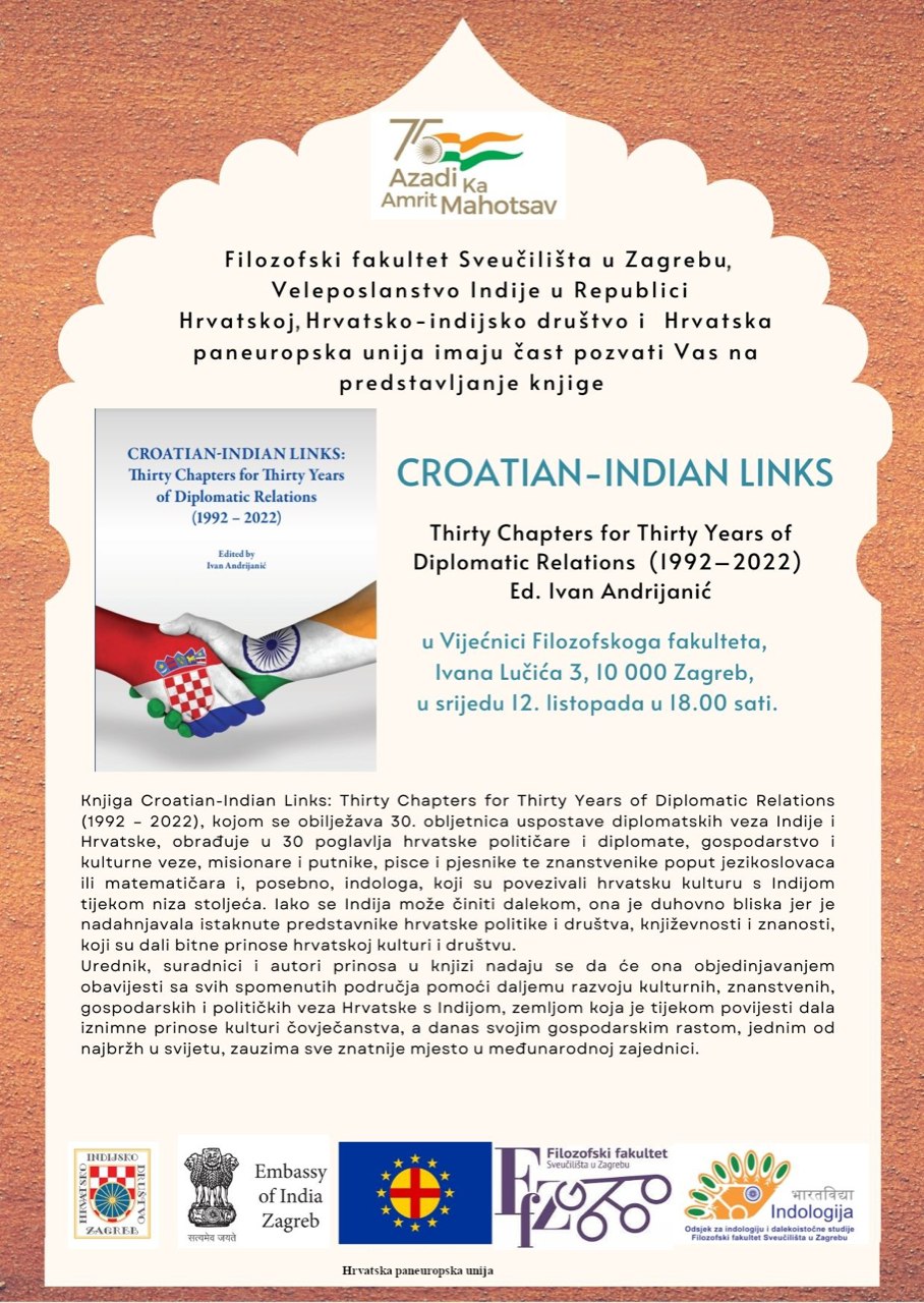 U srijedu, 12. listopada 2022. u 18 sati u Vijećnici Filozofskoga fakulteta u Zagrebu predstavlja se zbornik o hrvatsko-indijskim političkim, gospodarskim, znanstvenim i kulturnim vezama, u suorganizaciji Hrvatske paneuropske unije.
