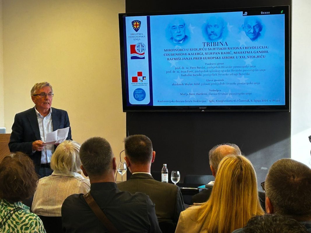 U prepunoj dvorani splitskog hotela Dioklecijan održana je 6. lipnja 2024. tribina posvećena Richardu Coudenhove-Kalergiju, Stjepanu Radiću i Mahatmi Gandhiju, političkim mirotvorcima u dvadesetom stoljeću.Nakon uvodnih govora prof. dr. sc. Pave Barišića i prof. dr. sc. Ivana Pavića, predsjednika Hrvatske paneuropske unije, odnosno predsjednika Splitskog ogranka ove organizacije te Radoslava Zaradića, predsjednika Hrvatske udruge Benedikt, nastupio je kao glavni govornik akademik Mislav Ježić.