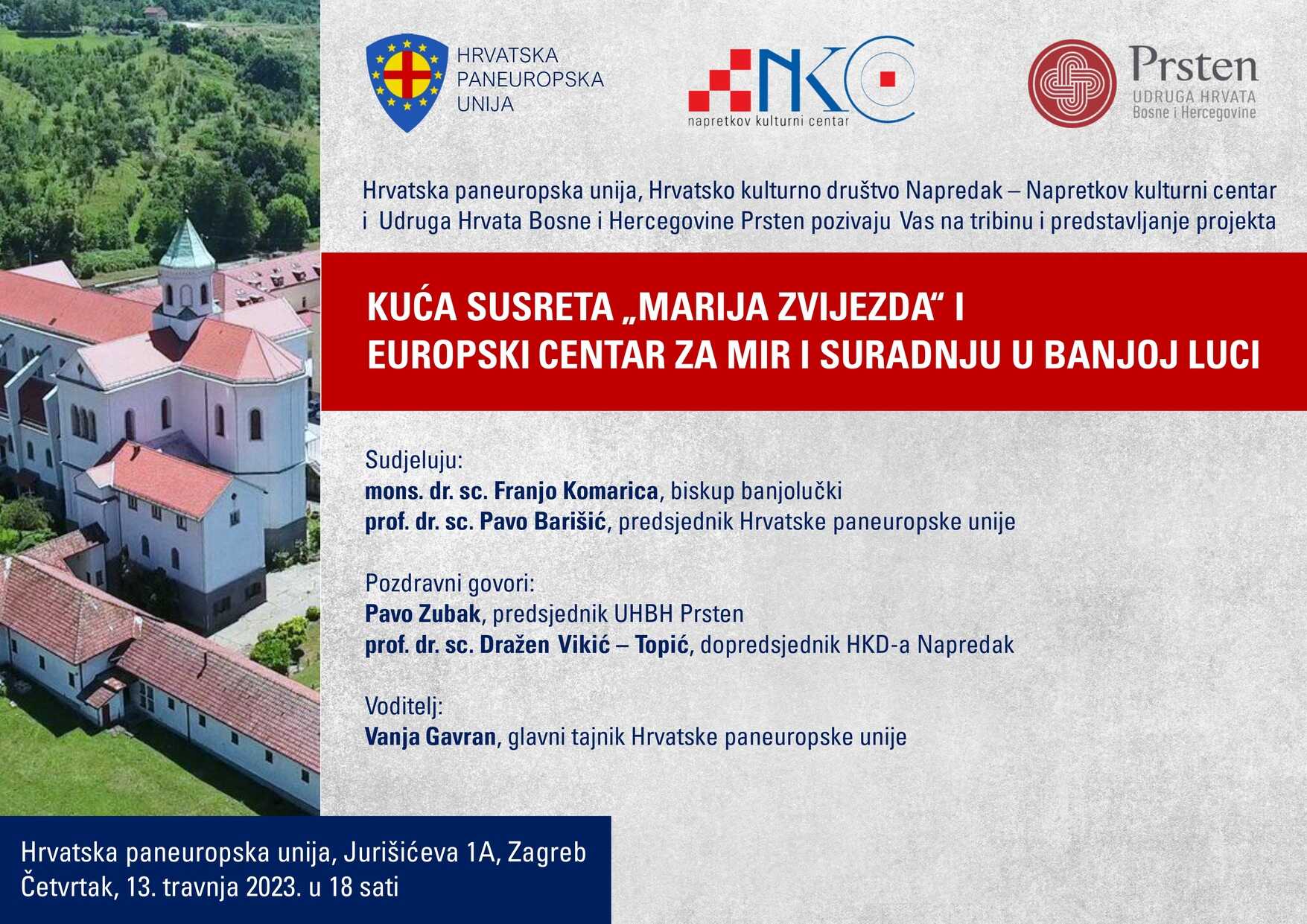 Sinoć, 14. travnja 2023. u prepunoj dvorani Hrvatske paneuropske unije u Zagrebu održana je tribina i predstavljanje projekta Kuća susreta „Marija Zvijezda” i Europski centar za mir i suradnju u Banjoj Luci.
